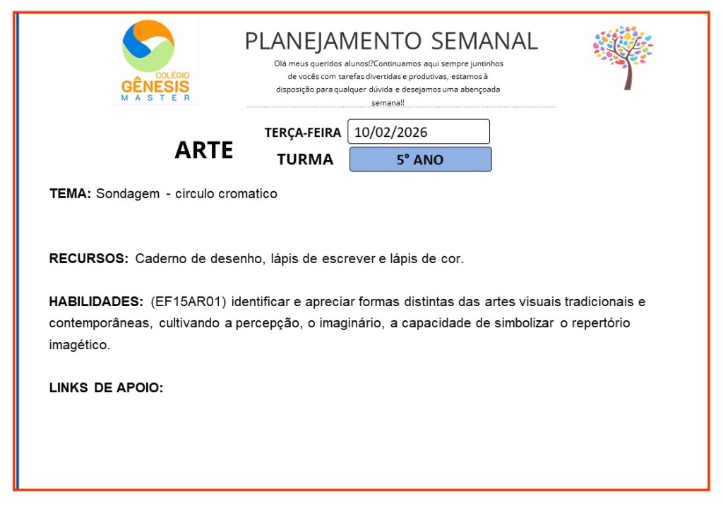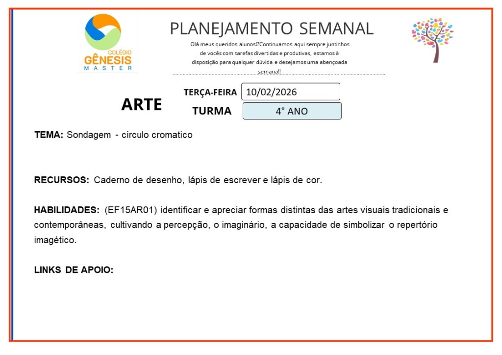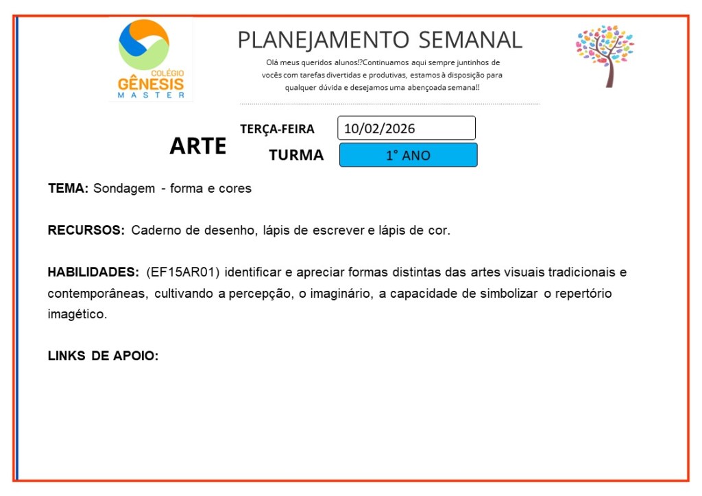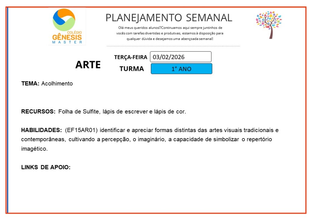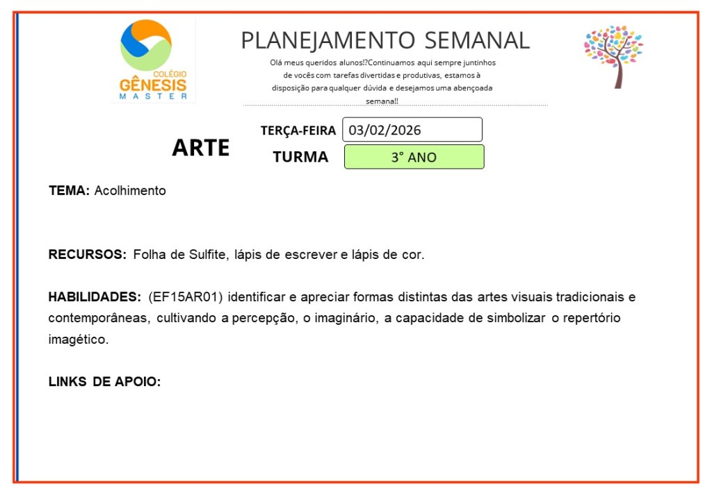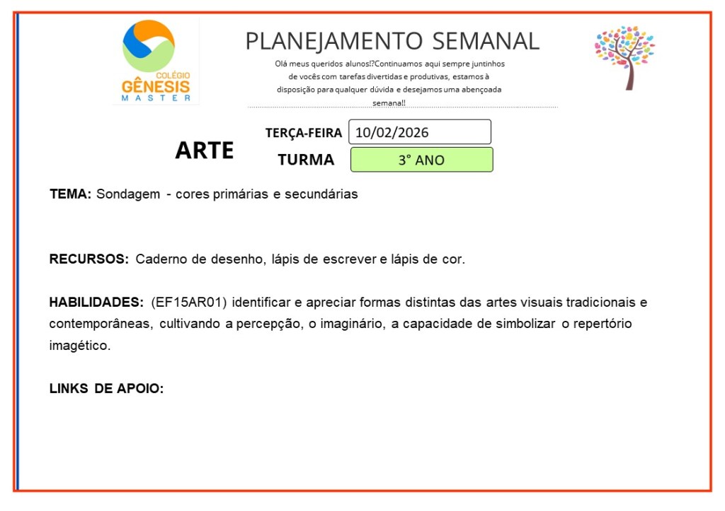 ARTE Olá meus queridos alunos!Continuamos aqui sempre juntinhos de vocês com tarefas divertidas e produtivas, estamos à disposição para qualquer dúvida e desejamos uma abençoada semana!! ARTE 1002Baixar ARTE 0302Baixar